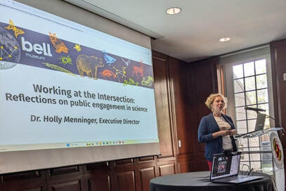 Although Dr. Menninger is now deeply involved in public engagement, it was not her original plan when she started at the University of Maryland as a student of Dr. Margaret Palmer. She also states she “never had an ah-ha moment” where she suddenly realized that was what she wanted to do – her career has been a journey in different areas of engagement (including science policy and extension) that ultimately led her to the museum field. While she was at UMD, she studied the effect of the nutrient pulse from the 2004 Brood X cicada emergence (and subsequent input to many streams) on stream metabolism. These periodical cicadas took flight across the Washington DC Metro area after seventeen years of feeding on tree roots as nymphs. When they came out and generated interest in the public, Dr. Menninger – as part of a group of grad students known as the “Cicadamaniacs” -- found herself the spokesperson. She noted that she had her first foray in media outreach live on CNN’s American Morning because Dr. Mike Raupp, the ‘Bug Guy,’ was appearing on ABC’s Good Morning America.