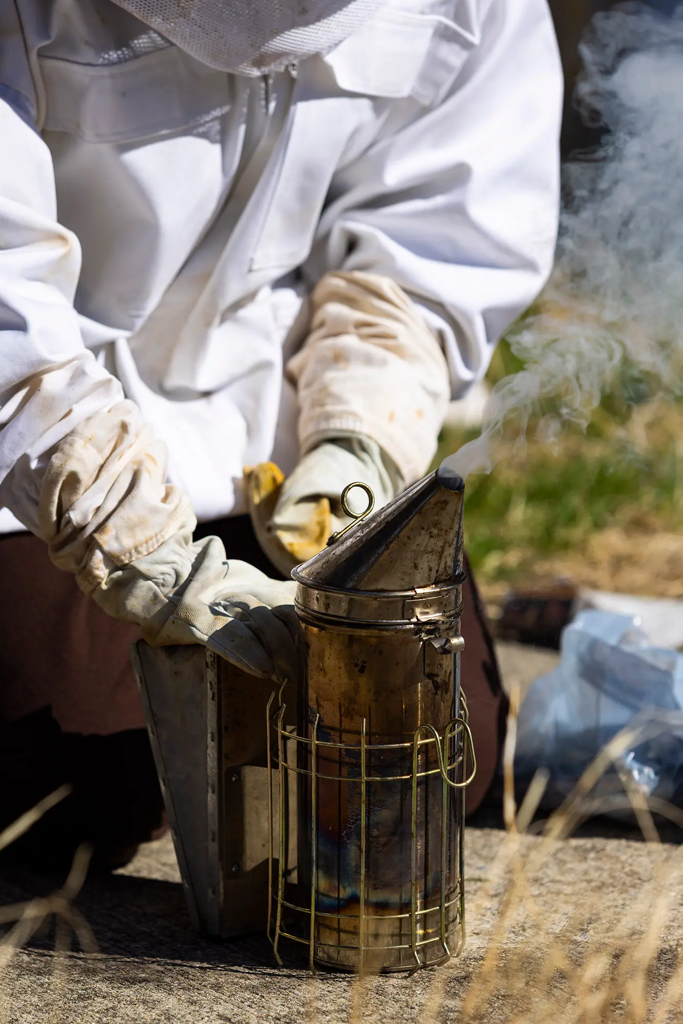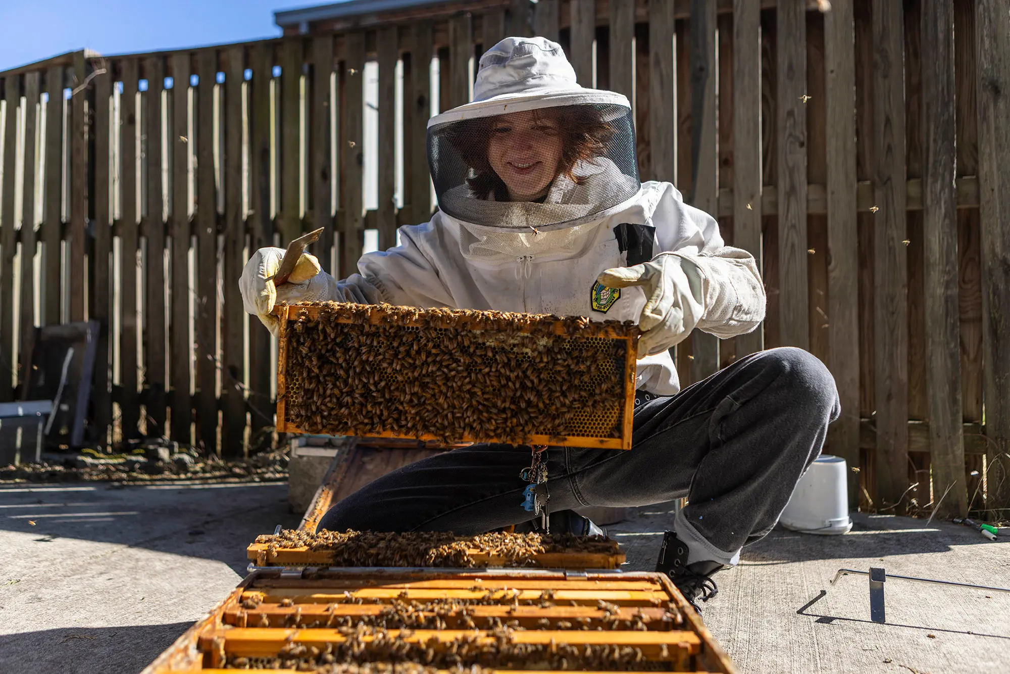 Smoke wafting from a can in her heavily gloved hand, mechanical engineering major Lila Wilson ’26 bent down in her bee suit to examine one of three student-managed hives up the hill from the Xfinity Center.