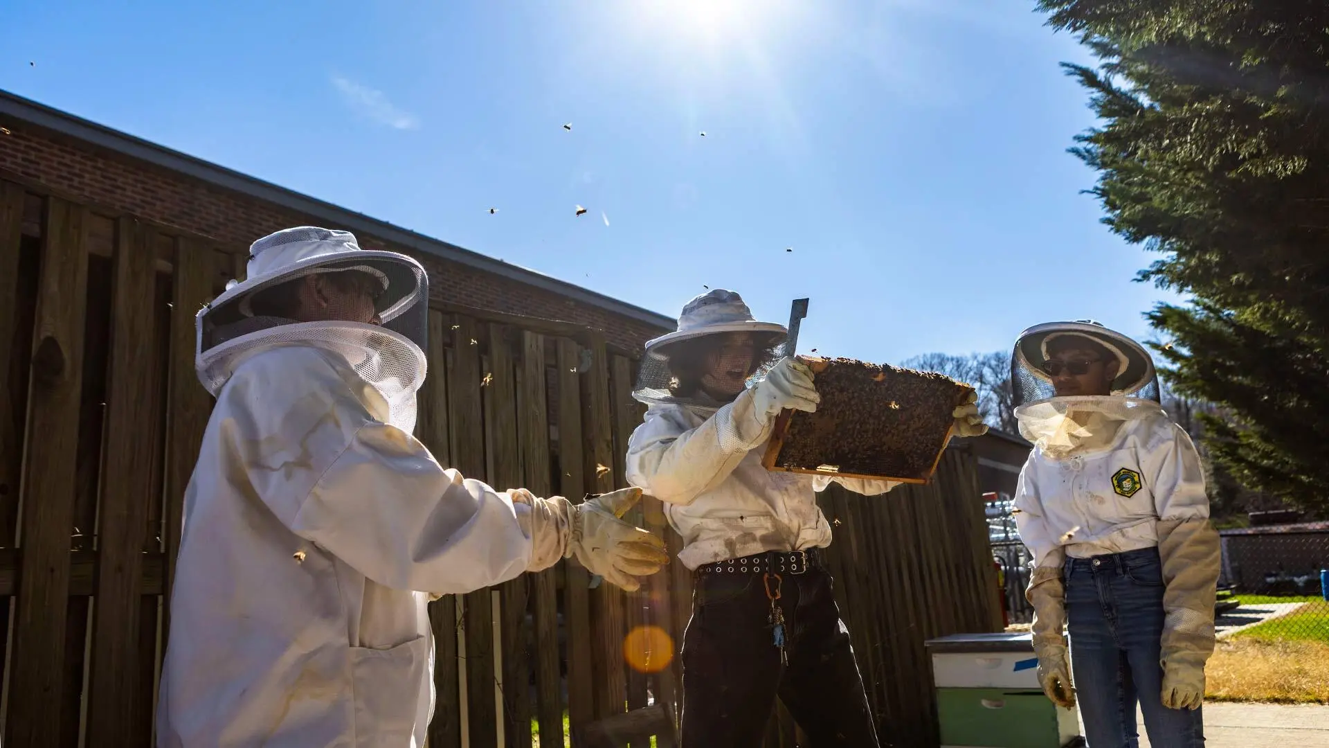 How It Got Started: Founded more than a decade ago, the club has gone through some tumultuous times with the cyclical rise and fall of its honeybees. A particularly cold winter can kill off colonies. A strong summer storm can send trees or branches crashing down and damage hives. Pests like varroa mites or hive beetles can weaken populations. But through it all, students have persisted in caring for the bees, first in the woods behind Xfinity Center, and now in a more accessible location outside the Research Greenhouse.