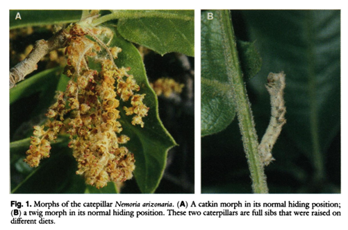 Polyphenism is the phenomenon of a single genotype producing two or more distinct genotypes in response to different environmental conditions, and it is one important source of phenotypic plasticity. One example from the insect world is the oat catkin caterpillar, whose morphology depends on whether their larval diet is composed of leaves, which are high in tannin, or catkins, which are low in tannin. The high-tannin-fed caterpillars develop into twig morphs, whereas low-tannin-fed caterpillars develop into catkin morphs (Greene 1989).