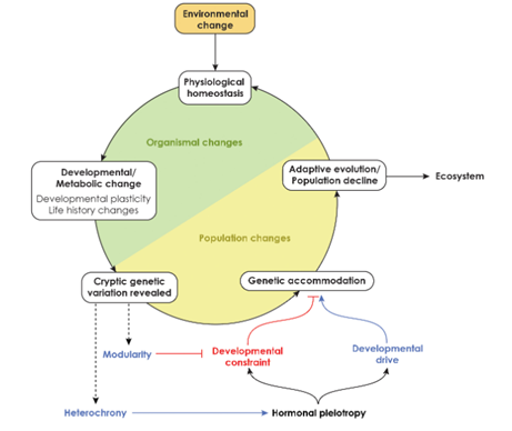 Climate change and the corresponding environmental changes may interact with existing genetic variation to shape future evolutionary success. The figure below (Fig. 5) visualizes the impact of climate change on development and the resultant effects on populations and the ecosystem. The degree to which populations can acclimate and adapt will determine whether they will thrive in a heating world. The Suzuki lab showed that developmental hormones can influence how ecological changes affect biology and development. The Suzuki lab has done a lot of work to unravel these processes but, of course, there are many questions still to be answered.