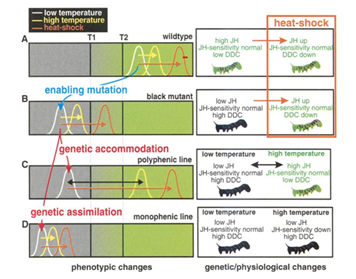 This brings us back to the Suzuki lab who utilized a polyphenism in M. sexta larvae to study how the evolutionary processes of genetic accommodation and assimilation operate under high temperatures. The specific polyphenism studied was a variation in larval body color. Figure 4 (A) shows the population prior to the enabling mutation; phenotypic variation is low, and larvae are wildtype in color irrespective of temperature. The enabling mutation leads to a black mutant type shown in (B). Larvae can still develop with the wildtype body color when subjected to heat shocks. After several successive generations, the population became polyphenic (C), with both body colors possible for the population, depending on temperature, displaying the phenomenon of genetic accommodation. Finally, (D) shows a monophenic population where the black mutant phenotype has become stable in the population and is evident even at low temperatures, such that genetic assimilation has occurred (Suzuki and Nijhout, 2006). These phenotypic variations were correlated with JH activity. Thus, temperature and JH can modulate phenotype, and this can lead to changes in insect population structures as the climate warms.