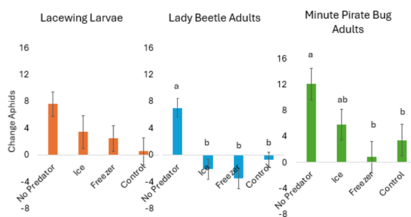 Dr. Wallingford also looked into the amount of time it took for the animals to recover from an induced chill coma and the levels of prey consumption after chill coma recovery. The animals were put into small tubes and divided into groups. Some of the groups were put in a freezer to experience subfreezing temperatures for 30 minutes, other groups were put in a cooler of ice to experience freezing temperatures for 24 hours. After exposure to the freezing temperatures, the animals were observed and the amount of time it took for the animals to emerge from their tubes was recorded. Even after the exposure to freezing and subfreezing temperatures, the animals were still able to recover. Animals that emerged from their tubes were then placed in cups with aphid-infested spinach leaves for 24 hours. After the 24 hours passed, the change in the number of aphids per cup was calculated to see how the chill coma affected prey consumption. The number of aphids in the cups with the generalist walking predators was consistently lower than the number of aphids in the cups with no predators. This shows that even though there were varying levels of prey consumption, the animals were still eating prey after they had recovered from the chill coma (Fig. 3). For farmers looking for solutions to winter-time pests, predators that survive chill injuries could prove to be useful.