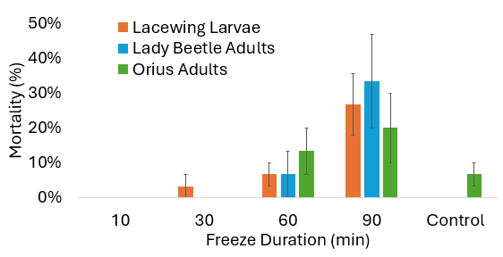 To determine how the predators respond to potentially lethal winter temperatures, they were exposed to freezing temperatures for different lengths of time, ranging from 10 minutes to 90 minutes. The animals were then allowed to recover at room temperature for 30 minutes before mortality rates were assessed; a control group was held at room temperature for 120 minutes. It was found that mortality rates remained fairly low until the insects were subjected to the lethal temperatures for 90 minutes; even then, the mortality rates did not exceed 50% and there was no difference between species (Fig. 2). Therefore, the predators are not threatened by acute freeze injury.