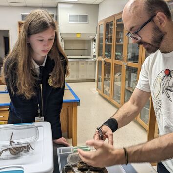 Todd has been a leader in implementing the educational and land grant mission of our university, using insects to educate students and the public about STEM. Since 2017, Todd has maintained a blistering pace with the Insect Zoo. The zoo has been featured in approximately 100 events, reaching approximately 10,000 people. In this short time, he has had an immensely positive influence on learners from across academic environments. At UMD, Todd has been instrumental in: the Insect Petting Zoo at Maryland Day, an event that President Pines and UMD’s First Lady eagerly wait alongside community members for their chance to hold an insect; Entomology minor recruitment events on Hornbake Plaza where Todd talks up insects’ impacts on our environment; and classroom visits where Todd and Entomology professors introduce undergrads to the incredible diversity of arthropods. A few examples of the type of impact Todd’s Outreach work has had include: a classroom discussion with a Montgomery College Biology Class about insects as models across interdisciplinary studies; a presentation at Rockview Elementary School on insect anatomy and metamorphosis; and an exhibit in St. Mary's County where attendees learned about the Arizona blonde tarantula, among other fascinating arthropods.